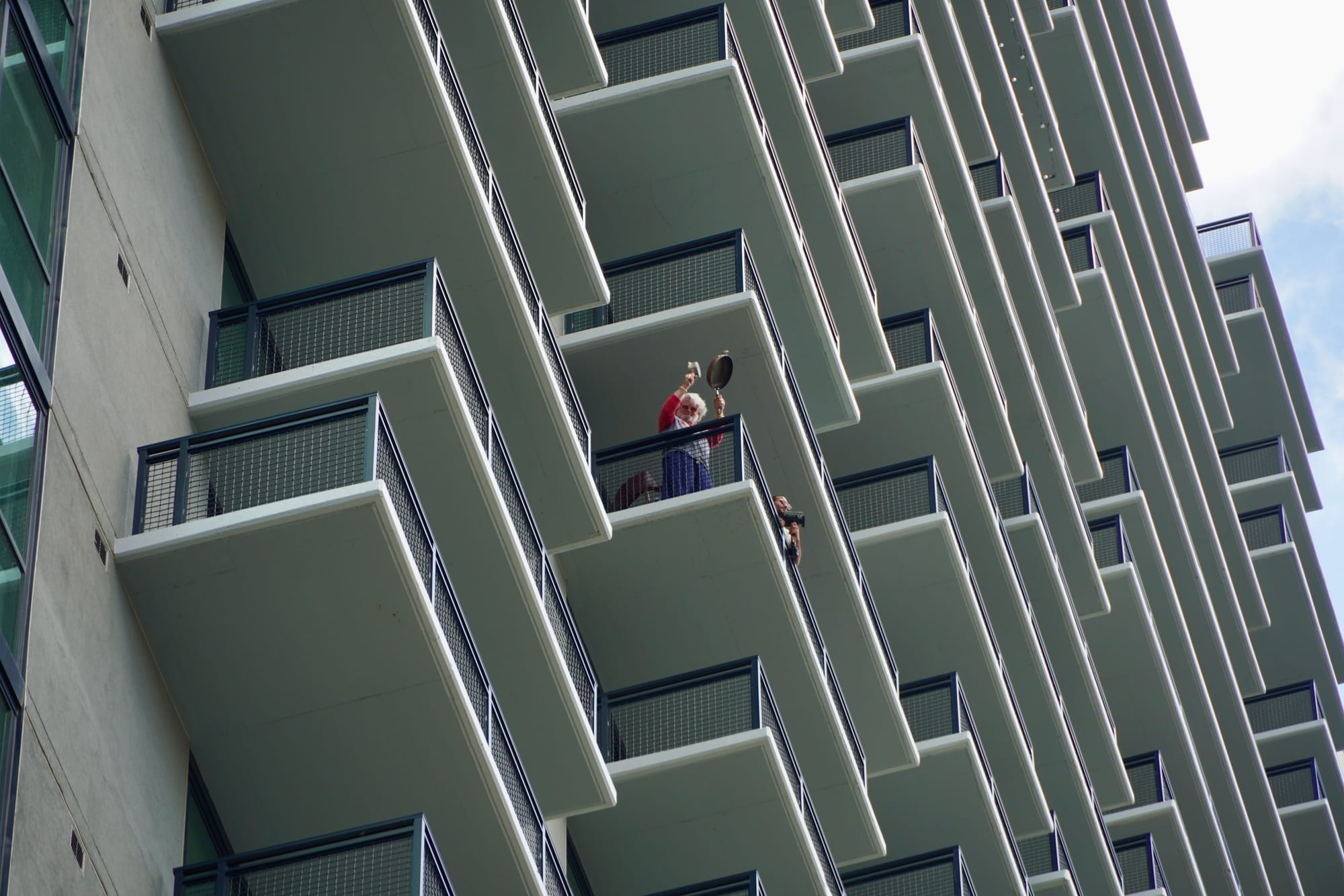 You get used to the soundscape of an event like this: chanting, sirens, the occasional car horn in support, but one sound on the edge got to me. It was the clanking of pots and pans from an apartment balcony. I looked up and snapped this shot.